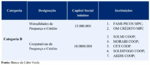 Importa referir que as Instituições de Microfinanças de Categoria B são aquelas que apenas recebem depósitos e captam poupanças, exclusivamente dos seus membros ou sócios, concedem créditos e praticam outros serviços financeiros a favor dos mesmos ou terceiros.