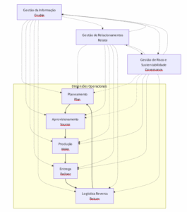 Gestão da Informação posiciona-se como o facilitador crítico desta integração. Sem um fluxo de informação de alta fidelidade e em tempo real, a visibilidade do ecossistema desvanece-se, e as decisões tomadas em qualquer dimensão passam a assentar em alicerces débeis. De igual modo, a Gestão de Risco e Sustentabilidade atua como um princípio orientador estratégico, impondo constrangimentos e diretrizes que influenciam transversalmente todas as outras dimensões – da seleção de fornecedores (Aprovisionamento) ao modelo de distribuição (Entrega) e ao fim de vida útil do produto (Logística Reversa).