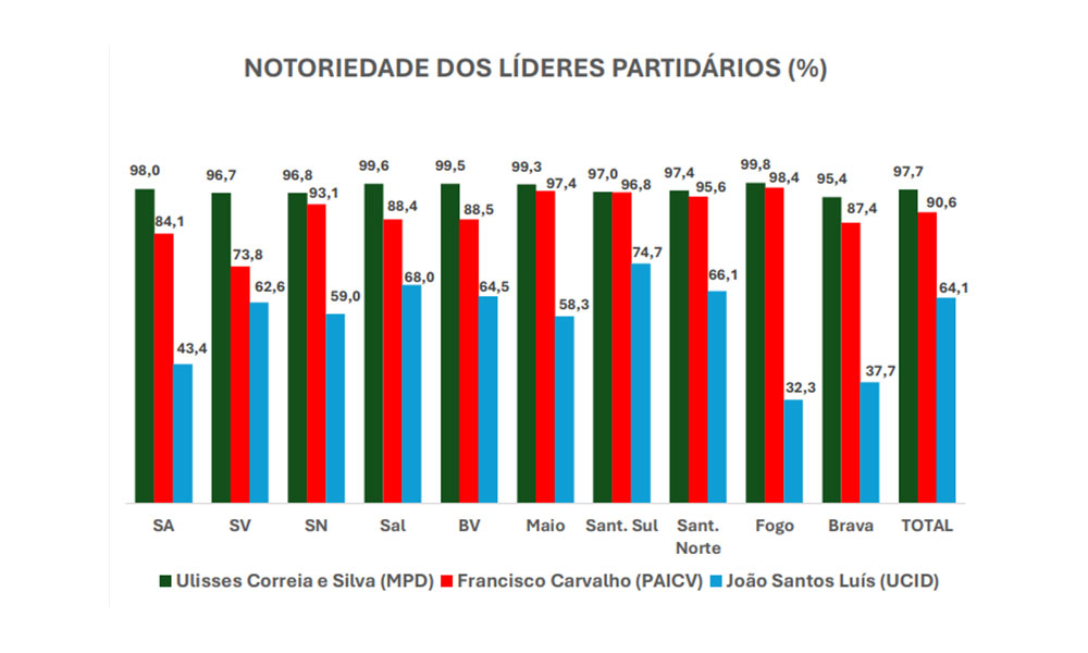 De acordo com os dados, o líder do MpD, Ulisses Correia e Silva, apresenta um nível de notoriedade “muito elevado, situando-se entre 95% e 100% na maioria dos círculos eleitorais”.