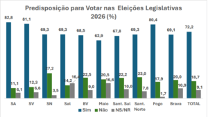 Uma sondagem nacional realizada pela Afrosondagem, entre os dias 26 e 30 de dezembro, para conhecer as percepções dos cabo-verdianos sobre os líderes partidários e a direção dos votos, caso as eleições legislativas fossem realizadas em finais de dezembro de 2025, revela que o Movimento para Democracia (MpD – poder) parte em vantagem nas intenções de voto para as próximas eleições legislativas, ao mesmo tempo que evidencia uma forte predisposição dos eleitores cabo-verdianos para participar no escrutínio. 72% dos inquiridos afirmam que pretendem votar, enquanto 19% dizem que não irão participar e 9% permanecem indecisos ou preferiram não responder.