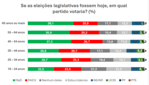 Por faixas etárias, o MpD apresenta maior força entre os eleitores mais velhos, especialmente a partir dos 45 anos, enquanto o PAICV mantém um desempenho mais equilibrado entre todas as idades.