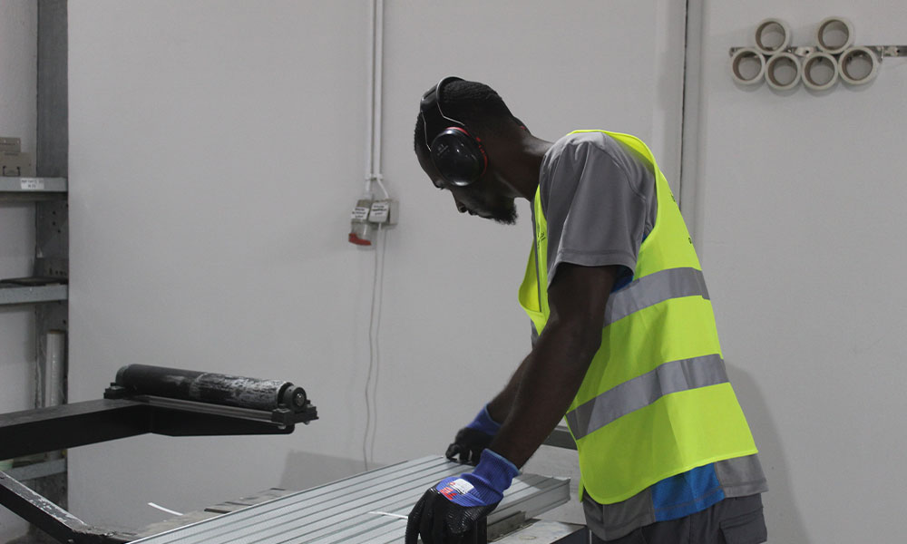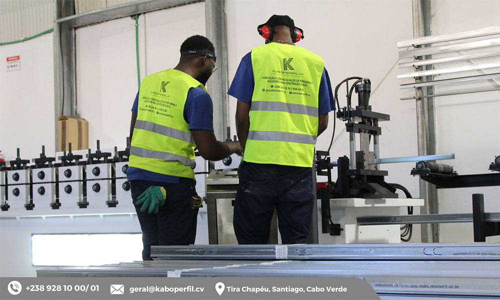 Essa unidade de fábrica industrial, em Cabo Verde, permite que todos os produtos que antes eram importados pela Gesso Perfil sejam produzidos localmente, desde o perfil para tetos falsos até paredes interiores, que substituem o bloco tradicional.