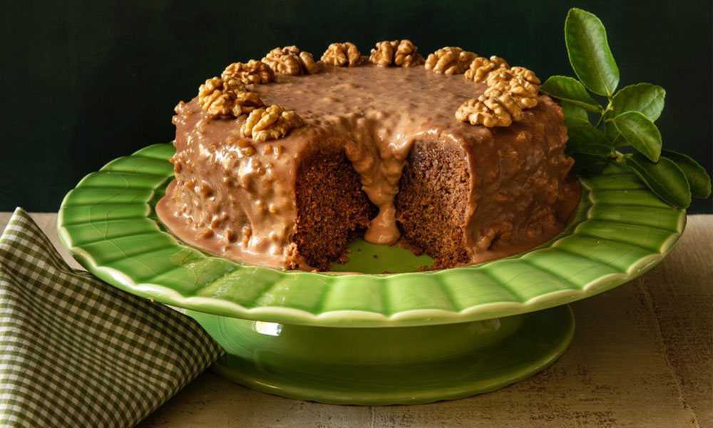 8- Quando o bolo estiver arrefecido, cubra com a mistura anterior e polvilhe com o miolo de noz.
