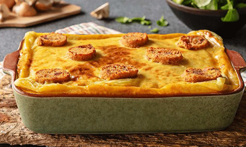 Empadão de alheira com cogumelos e agrião