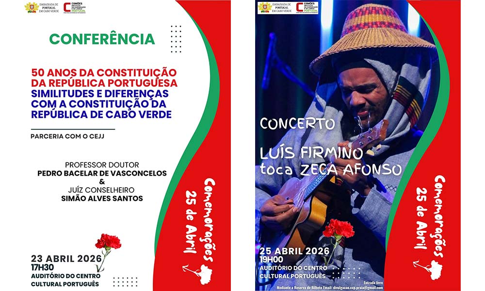 O Centro Cultural Português (CCP) será palco de atividades alusivas à comemoração dos 50 anos da Constituição da República Portuguesa. Hoje, 23 de Abril, às 17h30, acontece uma conferência com o tema “50 anos da constituição da República Portuguesa. Similitudes e Diferenças com a Constituição da República de Cabo Verde” e, no dia 25 de Abril, às 19h, tem lugar o concerto Luís Firmino toca Zeca Afonso.